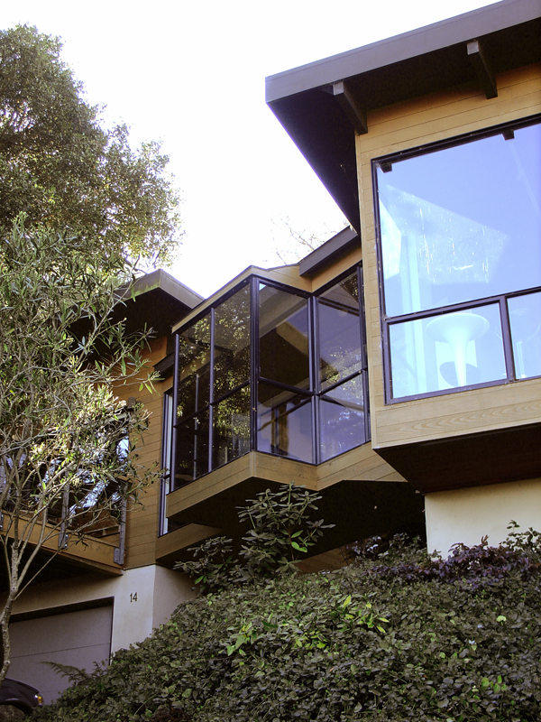 A tree house on the property inspired these flanking pavilions connected by glass bridges that also define the entry and limited outdoor space on a hillside lot.